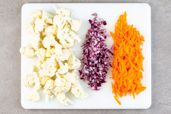 Den Blumenkohl in mundgerechte Stücke schneiden. Die Zwiebel schälen, halbieren und fein würfeln. Die Karotte ggf. schälen und grob raspeln.