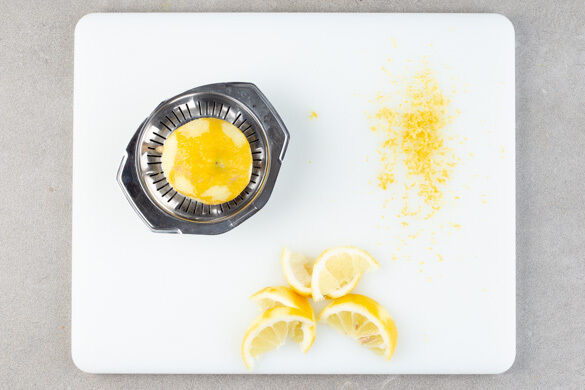 Die Zitronenschale abreiben und die Zitrone halbieren, eine Hälfte auspressen, die andere Hälfte in Spalten schneiden.