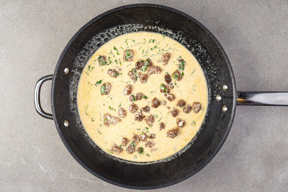 Wenn die Tage kürzer werden, kehrt auch das Verlangen nach herzhaften und wohlig füllenden Speisen wieder zurück. Zum Glück haben wir etwas Passendes für dich kreiert: Fein-würzige Rindswursthappen dürfen in der Pfanne in einer cremigen Sauce schmurgeln. Dazu gesellen sich gebackene Pilze, mit Kreuzkümmel verfeinerter Rosenkohl und al dente gekochte Orecchiette-Pasta. So harmonisch vereint heißt es nur: Guten Appetit!