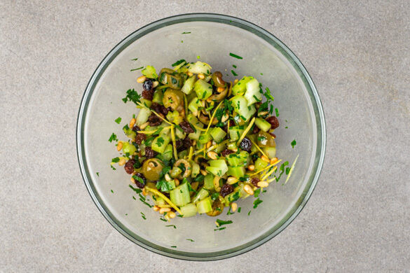 Den Stangensellerie, die Oliven, die Rosinen und die Pinienkerne in einer mittelgroßen Pfanne mit 1EL Olivenöl bei mittlerer Hitze unter Rühren 3–4Min. anbraten, bis die Pinienkerne goldbraun sind. Das Topping samt Öl aus der Pfanne nehmen und beiseitestellen.