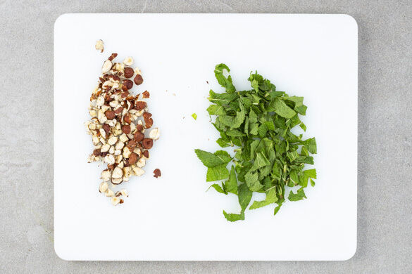 Die Minzeblätter abzupfen und grob schneiden. Die Haselnüsse grob hacken.