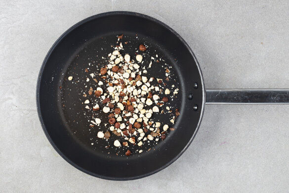 Die Haselnüsse in einer kleinen Pfanne ohne Zugabe von Fett bei mittlerer Hitze 1–2Min. goldbraun anrösten. Vorsicht, sie können schnell zu dunkel werden. Zum Abkühlen aus der Pfanne nehmen und beiseitestellen.