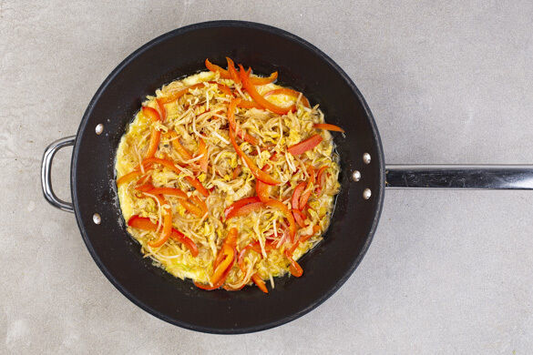 Die Eier mit der restlichen Sojasauce verquirlen. In der Pfanne 1EL Pflanzenöl bei mittlerer Hitze erwärmen. Das Ei hineingießen und ca. 1Min. ohne Rühren braten. Das Gemüse auf dem Ei verteilen und abgedeckt bei mittlerer bis niedriger Hitze 8–10Min. garen, bis das Ei gestockt ist. Das Omelett zusammenklappen, vierteln und mit der Sauce auf dem Reis anrichten.