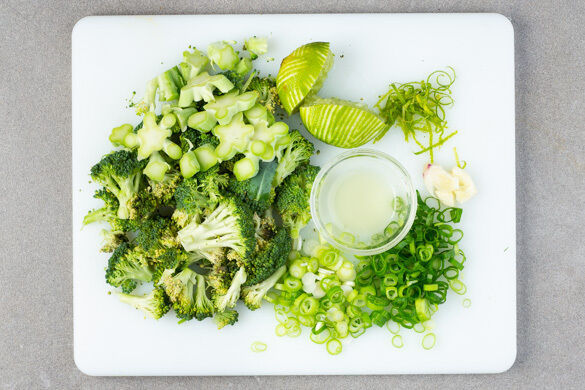 Den Brokkoli in 1–2cm große Röschen zerteilen. Den Brokkolistrunk ggf. schälen und in ca. 1cm dicke Scheiben schneiden, dabei die unteren 1–2cm entfernen. Die Lauchzwiebel in feine Ringe schneiden, die grünen Lauchzwiebelringe beiseitelegen. Den Knoblauch schälen und grob würfeln. Die Limettenschale abreiben, dann die Limette halbieren und auspressen.