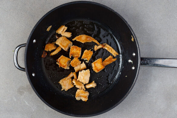Die veganen Hähnchenschnetzel in einer mittelgroßen Pfanne mit 1EL Olivenöl bei mittlerer bis starker Hitze auf einer Seite 2–3Min. goldbraun anbraten, dann wenden und von der anderen Seite braten, bis diese ebenfalls goldbraun und knusprig ist. Die Schnetzel vom Herd nehmen und warm halten.