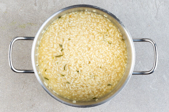 Den Reis und den Rosmarin in einem großen Topf mit 1EL Olivenöl bei mittlerer Hitze 1–2Min. anschwitzen. Den Reis mit 2EL hellem Essig ablöschen, dann nach und nach mit der Brühe ablöschen und stetig rühren, damit der Reis nicht ansetzt. Diesen Vorgang 18–20Min. lang wiederholen, bis die Brühe aufgebraucht und der Reis bissfest ist.