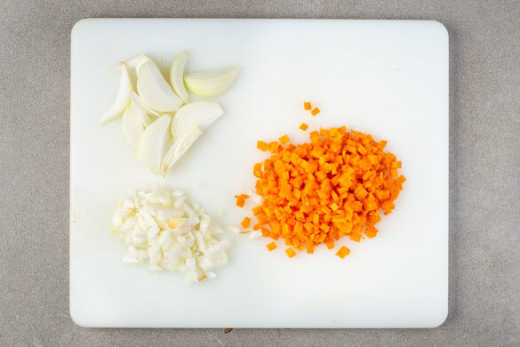 Die Zwiebeln schälen und halbieren, eine Zwiebel fein würfeln, die andere Zwiebel in ca. 1cm breite Spalten schneiden. Die Karotten ggf. schälen, längs vierteln und in ca. 0,5cm große Würfel schneiden.