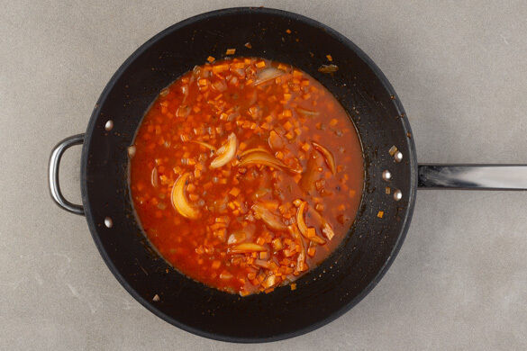 Das Tomatenmark, die Karotten und die 1/2 des Kümmels oder mehr nach Geschmack in einem mittelgroßen Topf mit 4EL Butter bei starker Hitze ca. 2Min. anbraten. 500ml Wasser, die Zwiebelspalten, 1TL Honig oder Zucker, 1TL Salz und 1 kräftige Prise Pfeffer hinzufügen und alles bei mittlerer Hitze ca. 15Min. köcheln lassen, bis die Sauce eingedickt ist, dabei gelegentlich umrühren.