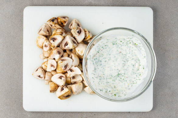 In einem großen Topf ausreichend gesalzenes Wasser für die Pasta zum Kochen bringen. Den Schnittknoblauch fein schneiden, dann mit dem Joghurt, 2TL Honig oder Zucker, 2TL Senf und 1 kräftigen Prise Salz verrühren. Die Pilze ggf. säubern und vierteln.