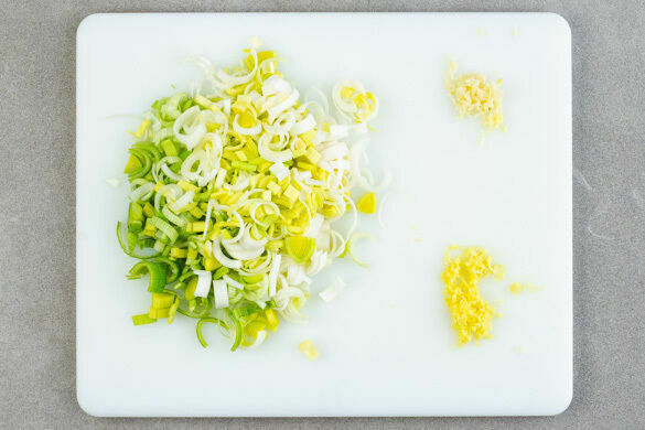 In einem mittelgroßen Topf 600ml leicht gesalzenes Wasser zum Kochen bringen. Den Lauch längs halbieren und in dünne Streifen schneiden. Den Knoblauch und den Ingwer schälen und fein reiben oder sehr fein würfeln.