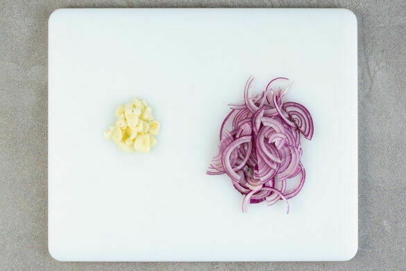 In einem großen Topf ausreichend gesalzenes Wasser für die Pasta zum Kochen bringen. Die Zwiebeln schälen, halbieren und in feine Streifen schneiden. Den Knoblauch schälen und in feine Scheibchen schneiden.