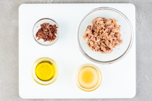 Den Thunfisch mit einer Gabel auflockern und die Sardellenfilets in feine Streifen schneiden. Das Öl jeweils aufbewahren.