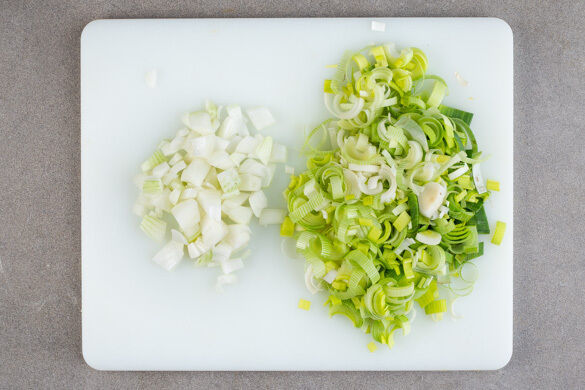 Den Lauch längs halbieren und in feine Streifen schneiden, dabei die oberen 1–2cm entfernen. Die Zwiebel schälen, halbieren und grob würfeln.