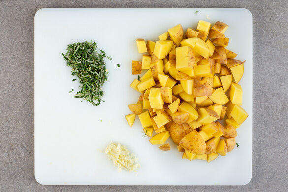 Inzwischen die Kartoffeln samt Schale in ca. 1cm große Würfel schneiden. Den Knoblauch schälen und fein würfeln. Die Rosmarinnadeln von den Stängeln streifen und grob schneiden.