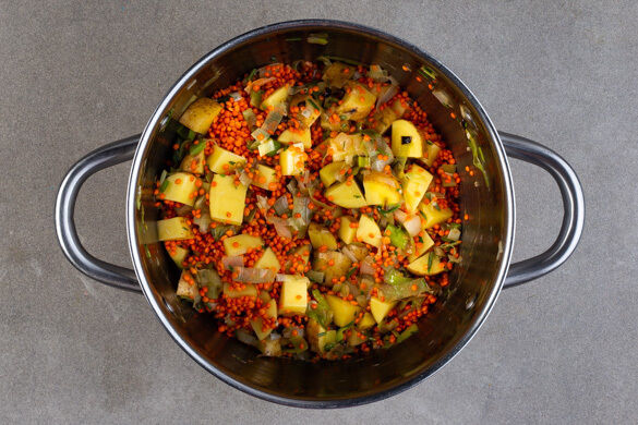 Wenn’s draußen langsam ungemütlich wird, machen wir es uns dafür in der Küche umso gemütlicher … und zwar mit diesem nährenden, herrlich würzigen Eintopf mit roten Linsen und Kartoffeln, fruchtigen Tomaten und pikanter Harissapaste, frischen Kräutern und reichlich Knobi. Und das Beste? Für das perfekte, Herz und Seele wärmende Erlebnis benötigen wir nur einen einzigen Topf – also wenn das nichts ist! Guten Appetit!