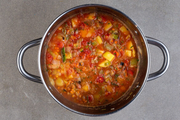 Die gehackten Tomaten, 2EL Essig und 600ml Wasser in den Topf geben. Den Eintopf mit Salz und Pfeffer abschmecken, zum Kochen bringen und dann abgedeckt bei mittlerer bis niedriger Hitze 15–17Min. köcheln lassen. Gelegentlich umrühren, damit die Linsen nicht am Boden ansetzen.
