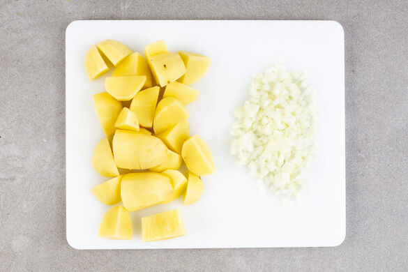 Die Kartoffeln und die Karotten in das kochende Wasser geben und in 12–15Min. bissfest kochen. In ein Sieb abgießen und abtropfen lassen, dabei ca. 1 Tasse Kochwasser auffangen. Die Kartoffeln und die Karotten zurück in den Topf geben und abgedeckt warm halten.