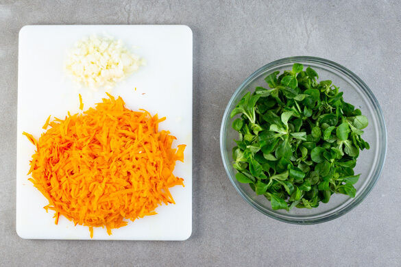 Den Backofen auf 240°C (220°C Umluft) vorheizen. Den Kürbis vierteln, mit einem Löffel entkernen und mit einer Küchenreibe grob raspeln. Die Zwiebel schälen, halbieren und in feine Würfel schneiden. Den Feldsalat ggf. verlesen.