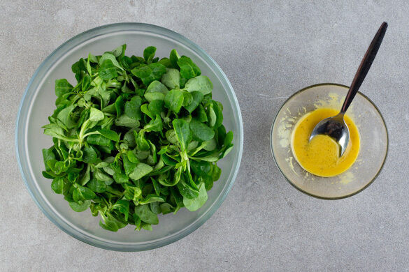 Die Eier mit der Crème fraîche und 50ml Wasser verquirlen. Mit Salz und Pfeffer würzen.