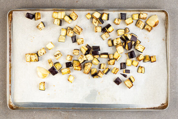 Die Auberginenwürfel mit 2EL Olivenöl und 1/2TL Salz auf einem mit Backpapier ausgelegten Backblech verteilen. Den Knoblauch samt Schale dazwischen legen und im Ofen ca. 12Min. mitrösten, dann herausnehmen und beiseitelegen. Die Auberginen in weiteren 8–13Min. goldbraun und weich backen.