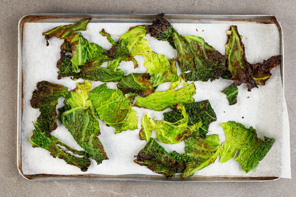Den Schwarzkohl mit der Gewürzmischung, 1EL Olivenöl sowie 1 kräftigen Prise Salz vermengen und auf einem zweiten mit Backpapier ausgelegten Backblech verteilen. Im Ofen 6–8Min. backen, bis der Kohl knusprig ist, dann zum Abkühlen herausnehmen. In einem Wasserkocher ca. 500ml Wasser zum Kochen bringen.