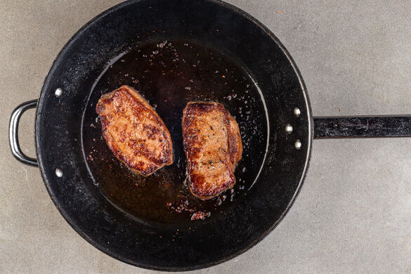 Das Fleisch trocken tupfen, mit je 1 kräftigen Prise Salz und Pfeffer würzen und in einer mittelgroßen Pfanne mit 1EL Olivenöl bei starker Hitze auf jeder Seite 2–3Min. braten, abhängig davon, ob es medium oder eher durchgebraten sein soll. Aus der Pfanne nehmen und bis zum Servieren auf einem Teller abgedeckt ruhen lassen.