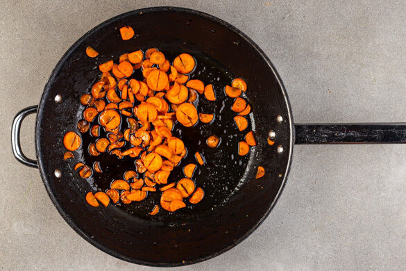 Die Karotten mit 1TL Honig und 1 Prise Salz in dieselbe Pfanne geben und so viel kochendes Wasser zugießen, bis die Karotten zur Hälfte bedeckt sind. Die Karotten ca. 6Min. abgedeckt köcheln lassen, dann den Deckel entfernen und 4–5Min. weiterkochen, bis die Flüssigkeit verdampft ist.