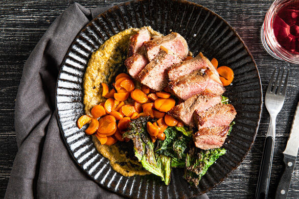 Wer braucht schon Kohlenhydrate, wenn es saftiges Steak mit einem Dip zum Niederknien gibt? Das Hüftsteak bettest du heute auf gebackenen Auberginen, die sich mit Tahini, Knoblauch und rauchiger Paprika zu einem eleganten Püree vereinen. Obendrein schmücken süß glasierte Karöttchen deinen Teller. Das Highlight sind aber gewürzte Schwarzkohlchips, die im Mund so richtig schön knuspern. Zufrieden? Sehr!