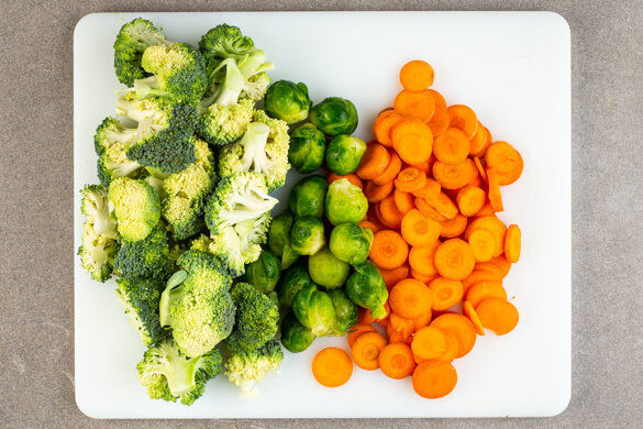 Die Karotte ggf. schälen und in dünne Scheiben schneiden. Den Rosenkohl halbieren. Den Brokkolistrunk schälen und in dünne Scheiben schneiden, dabei die unteren 1–2cm entfernen. Den Brokkoli in mundgerechte Röschen zerteilen.