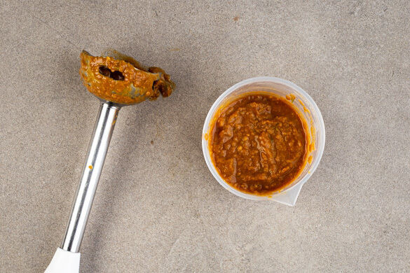 Nach ca. 25Min. Garzeit das Gemüse und den Schweinebauch auf dem Backblech mit der 1/2 der Sauce vermengen und gleichmäßig verteilt im Ofen bei 240°C (220°C Umluft) 5–7Min. backen, bis der Schweinebauch gebräunt und karamellisiert ist.
