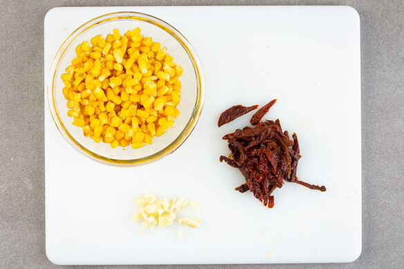 Den Backofen auf 240°C (220°C Umluft) vorheizen. Die getrockneten Tomaten in dünne Streifen schneiden. Den Knoblauch schälen und grob würfeln. Den Mais in ein Sieb abgießen und abtropfen lassen.