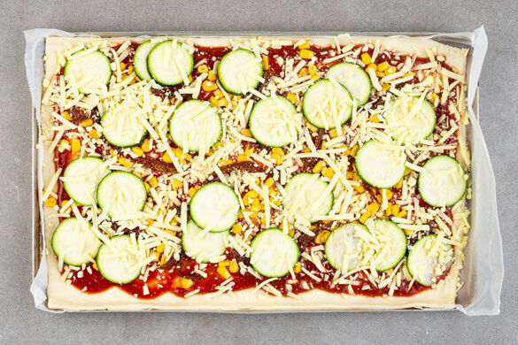 Den Teig zuerst mit dem Käse, dann mit der Zucchini, den restlichen getrockneten Tomaten und der 1/2 des Maises belegen. Die Pizza im Ofen 12–15Min. backen, bis der Boden knusprig und der Käse geschmolzen ist.