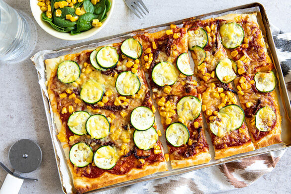 Wohoo, it is pizza night! Unsere leckere Pizza ist für alle da, denn wir bereiten sie heute mit veganem Käse zu, der einfach zum Dahinschmelzen ist! Der Spaß beginnt bereits in der Küche, wenn du die Sauce im Handumdrehen mit getrockneten Tomaten sowie ordentlich Knoblauch pürierst und dann beim Toppen die Zucchini, getrockneten Tomaten, den Mais und Käse ganz nach deinem Gusto verteilst. Nun aber pronto, pronto in den Ofen!
