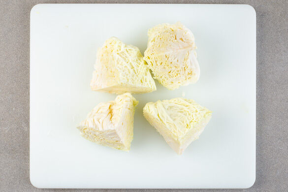 Den Backofen auf 240°C (220ºC Umluft) vorheizen. Den Wirsing der Länge nach vierteln, dabei darauf achten, die Blätter nicht vom Strunk zu lösen.
