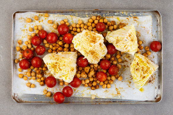Die Wirsingviertel auf das Backblech zu den Kichererbsen geben und vorsichtig mit der restlichen Gewürzmischung, 2EL Olivenöl und je 1 Prise Salz und Pfeffer einreiben. Im Ofen 18–20Min. backen, bis der Wirsing goldbraun ist und die Tomaten aufplatzen. Nach der Hälfte der Garzeit das Gemüse wenden.