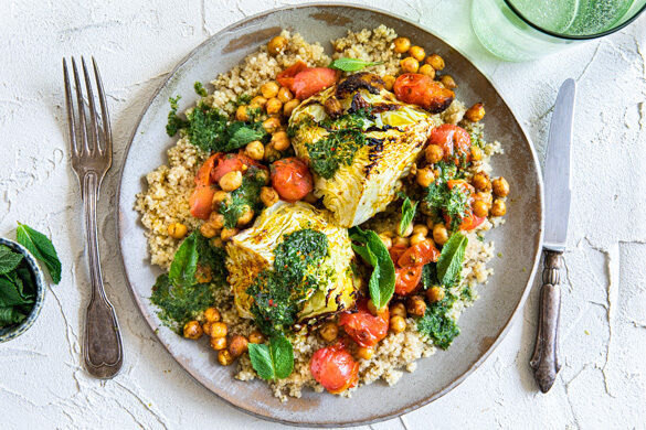 Schawarma ist eine Gewürzmischung, die unter anderem im Libanon und in Ägypten zum Würzen köstlicher Speisen verwendet wird. Heute dürfen sich Wirsing, Kichererbsen und Kirschtomaten über eine luxuriöse Salbung aus Kreuzkümmel, duftendem Zimt, goldenem Kurkuma und Nelken freuen. Im Ofen gebacken und auf lockerer Quinoa serviert, sei ihnen die feine Erfrischung in Form eines Minze- und Korianderchutneys ebenfalls gegönnt.