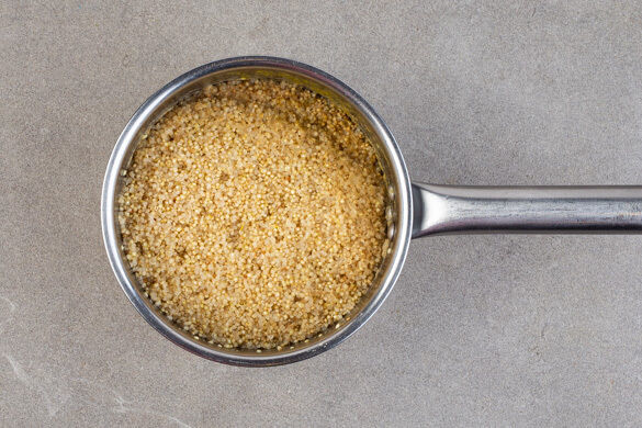 Inzwischen die 1/2 des Brühgewürzes mit 650ml Wasser in einem mittelgroßen Topf zum Kochen bringen. Die Quinoa in einem feinmaschigen Sieb mit warmem Wasser abspülen, in das kochende Wasser geben und 10–12Min. abgedeckt bei niedriger bis mittlerer Hitze sanft köcheln lassen. Vom Herd nehmen und bis zum Servieren warm halten.