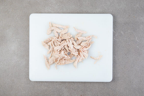 Den Backofen auf 240°C (220°C Umluft) vorheizen. In einem Wasserkocher reichlich Wasser aufkochen. Das Fleisch mit 1 Prise Salz in einen mittelgroßen Topf geben und mit dem kochenden Wasser übergießen, dann bei mittlerer Hitze ca. 10Min. sanft köcheln lassen. Das Fleisch herausnehmen, kurz abkühlen lassen und mit zwei Gabeln zerzupfen. Das Kochwasser aufbewahren.