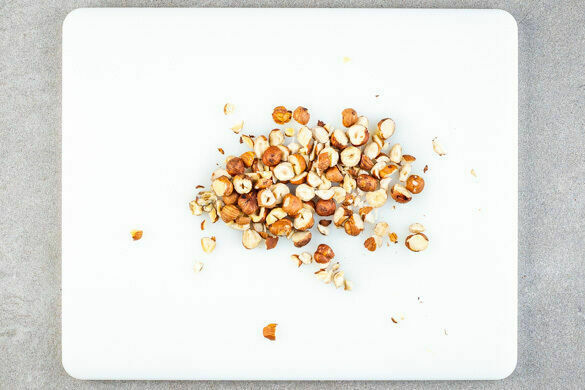 Die Haselnüsse in einer großen Pfanne ohne Zugabe von Fett bei mittlerer Hitze 1–2Min. goldbraun anrösten. Vorsicht, sie können schnell zu dunkel werden. Zum Abkühlen aus der Pfanne nehmen und anschließend grob hacken. Die Pfanne aufbewahren.