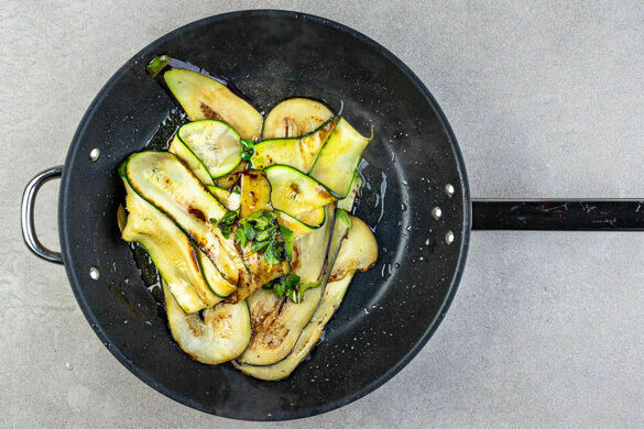 Die Zucchini und die Auberginen längs in 2–3mm dünne Scheiben schneiden. Mit 1/2TL Salz bestreuen und 1–2Min. ziehen lassen, dann die ausgetretene Flüssigkeit mit etwas Küchenkrepp abtupfen.