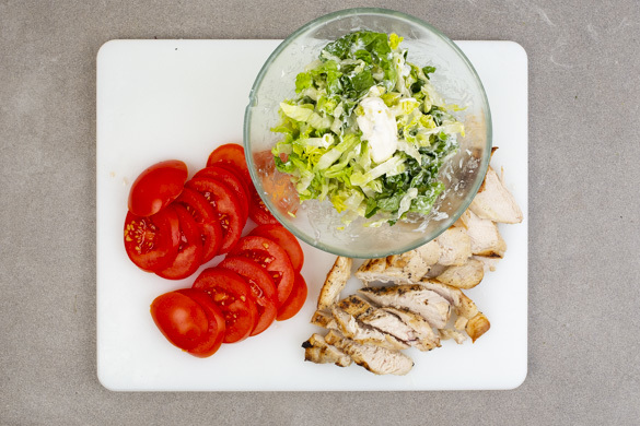 Die Tomaten in dünne Scheiben schneiden, dabei den Strunk entfernen. Den Salat in feine Streifen schneiden und mit 4EL des Dips vermengen. Das Fleisch schräg in dünne Scheiben schneiden.