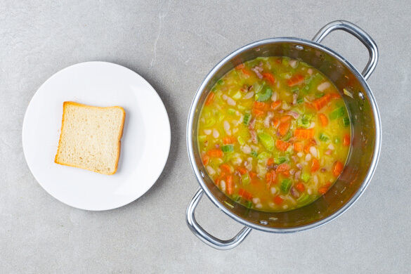 Ca. 2/3 des Lauchs, die Karotten, den Sellerie und die Baconstreifen in einem großen Topf mit 2EL Olivenöl und 1 Prise Salz bei mittlerer Hitze 5–6Min. anbraten. Die Bohnen in ein Sieb abgießen, mit dem Brühgewürz und 600ml Wasser zum Gemüse in den Topf geben und ca. 4Min. mitköcheln. 2 Scheiben Toast 5–7Min. im Ofen rösten oder toasten und beiseitelegen.