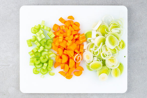 Den Backofen auf 220°C (200°C Umluft) vorheizen. Tipp: Wer später einen Toaster verwendet, benötigt den Ofen nicht! Den Lauch in dünne Ringe schneiden. Die Karotten ggf. schälen, längs halbieren und in dünne Scheiben schneiden. Den Sellerie ebenfalls in dünne Scheiben schneiden.