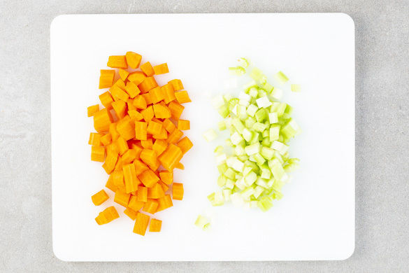 Die Karotten ggf. schälen, längs vierteln und in 0,5–1cm kleine Würfel schneiden. Den Stangensellerie längs halbieren und ebenfalls in kleine Würfel schneiden.