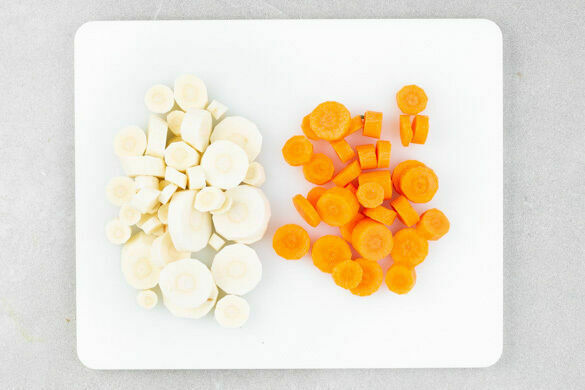 In einem großen Topf ausreichend gesalzenes Wasser für das Gemüse zum Kochen bringen. Die Pastinaken schälen und in dünne Scheiben schneiden. Die Karotten ggf. schälen und ebenfalls in Scheiben schneiden.