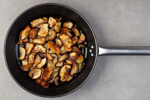 Den Topinambur ggf. schälen, längs halbieren und in ca. 0,5cm dicke Scheiben schneiden. Gleichmäßig verteilt in einer großen Pfanne mit 4EL Butter, 1/2TL Salz und 1 kräftigen Prise Pfeffer bei mittlerer Hitze 8–12Min. goldbraun und knusprig braten.