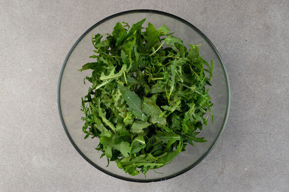 Den Rucola mit dem restlichen Balsamicoessig vermengen und nach Geschmack mit Salz und Pfeffer würzen.