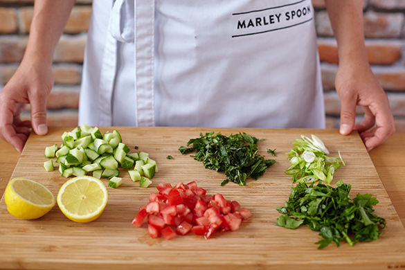Gemüse waschen. Tomate und Gurke grob würfeln, Lauchzwiebel in feine Ringe schneiden. Minze und Petersilie grob hacken. Alles in einer Schüssel beiseitestellen. 250ml Wasser im Wasserkocher oder kleinem Topf zum Kochen bringen.