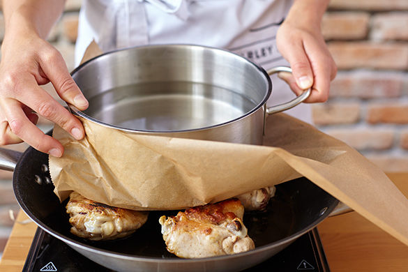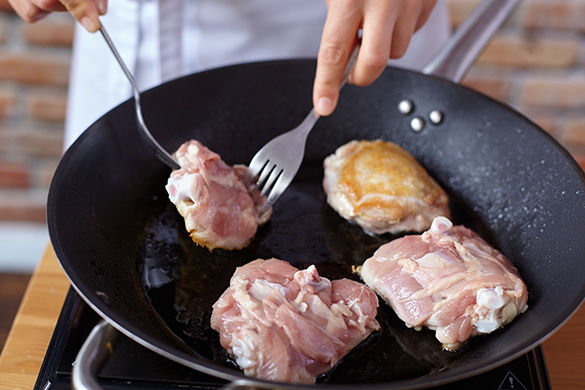 Große Pfanne mit 1EL Öl auf mittlere Hitze erhitzen. Fleisch trocken tupfen, salzen und pfeffern. Nun ca. 15-20Min. bei geringer Hitze und gelegentlichem Wenden kross fast gar anbraten. Für Schritt 4 sollte das Fleisch mit der Hautseite nach unten in der Pfanne liegen.