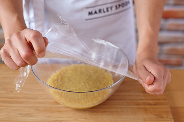 Bulgur in eine Schüssel geben und mit 250ml gerade gekochtem Wasser übergießen. Die Schüssel mit Frischhaltefolie abdecken, ca. 15-20Min. ziehen lassen und anschließend , wenn nötig, restliches Wasser abgießen.